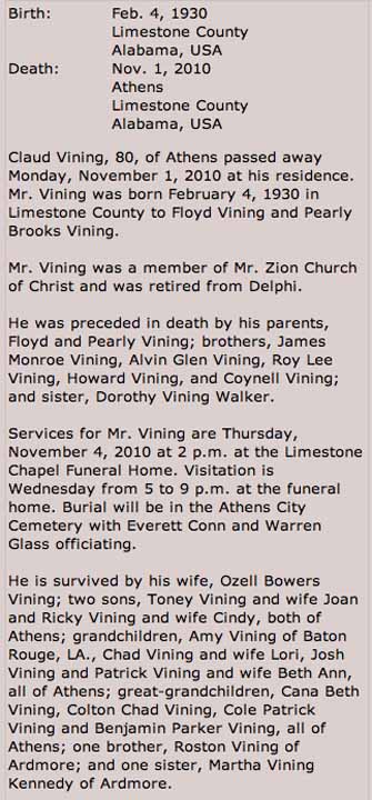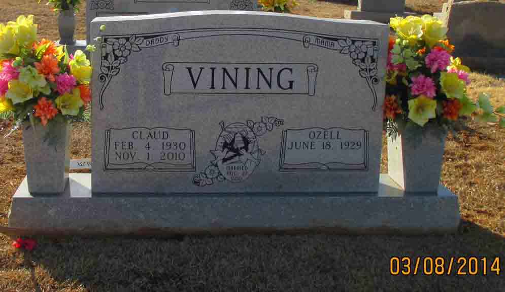 Headstone for Claud Vining and Ozell (Bowers) Vining, in Athens City Cemetery, Athens, Limestone County, Alabama (from Find A Grave):