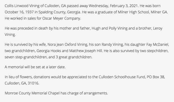 Obituary for Collis Linwood Vining (from website of Monroe County Memorial Chapel):
