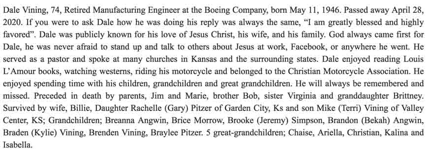 Obituary for Dale Vining (from Baker Funeral Home; Valley Center, Kansas):