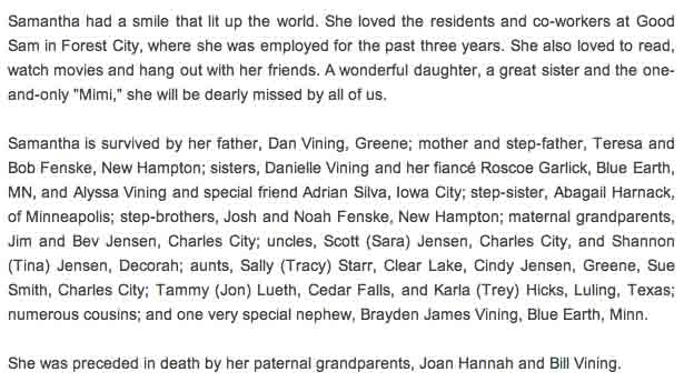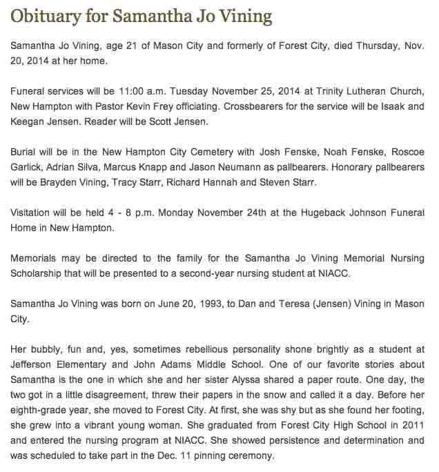 Obituary for Samantha Jo Vining, daughter of Dan Vining and Teresa Jensen:
