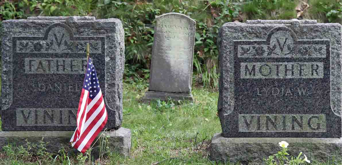Gravestones for Daniel Vining and Lydia (Whelpdale) Vining, in North Weymouth Cemetery, Weymouth, Norfolk County, Massachusetts (from Find A Grave):