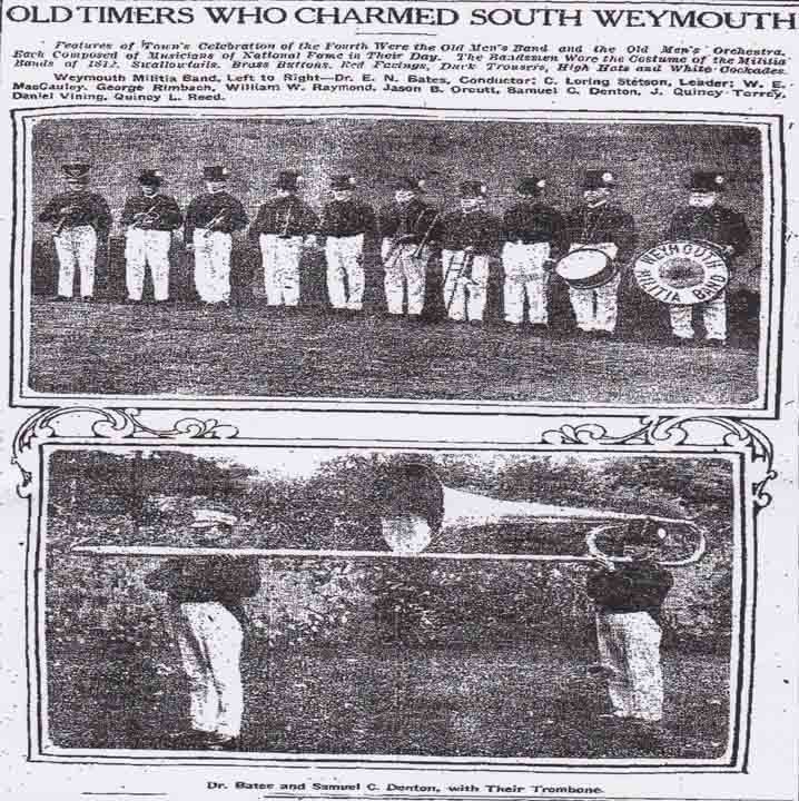 Daniel Vining (with snare drum near right end of line) was a member of the Weymouth Militia Band. (from Baston [Massachusetts] Herald, 5 July 1906, page 4)