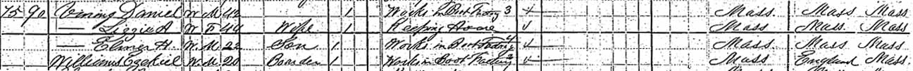 1880 Weymouth, Norfolk County, Massachusetts - dwelling 75, family 90. Also living in this household in 1880 was Ezekiel Williams (boarder, 20 y., b. MA).: