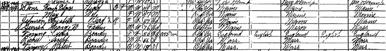 1920 Berwick, York County, Maine - dwelling 138, family 160. In 1920, both Lydia (widowed and a "laborer" in a woolen mill) and son Robert (single and a "sailor" in the U.S. Navy) were boarding in the household of Frank Edgar and May Stone.: