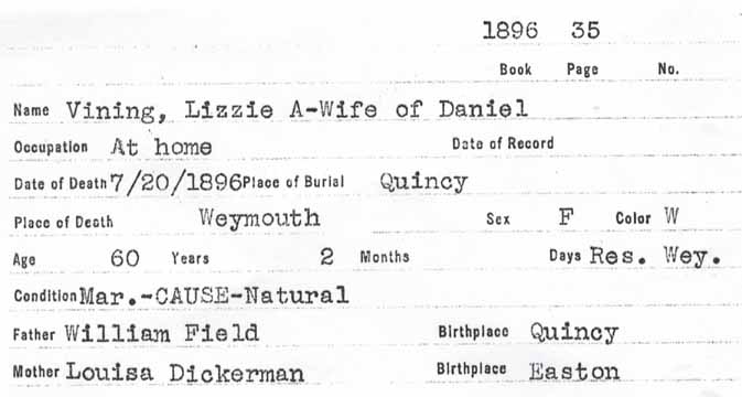 Death record for Elizabeth Ann (Field) Vining: