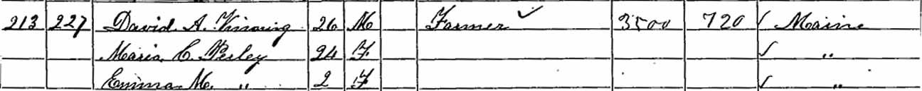1860 Lewiston, Androscoggin County, Maine - dwelling 213, family 227. Also living in this household in 1860 was Emma M. Perley (2 y., b. Maine), likely the daughter of Maria C. (Vining) Perley.: