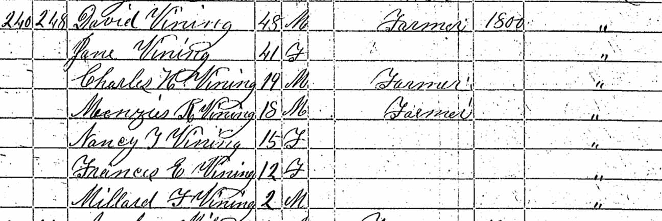 1860 Strong, Franklin County, Maine - dwelling 344, family 349. Charles H. Vining's family lived in the same dwelling as his mother, Jane C. (Thomas) Vining, and those siblings of his that were still living with her. Munzies R. Vining appears to have been listed twice in the 1860 census--both times as 28 years old--as a "gentlemen" in the household of his mother and also as a "flour dealer" living in Farmington, Maine, in the household of landlord Samuel F. Stoddard, dwelling 511, family 547.: