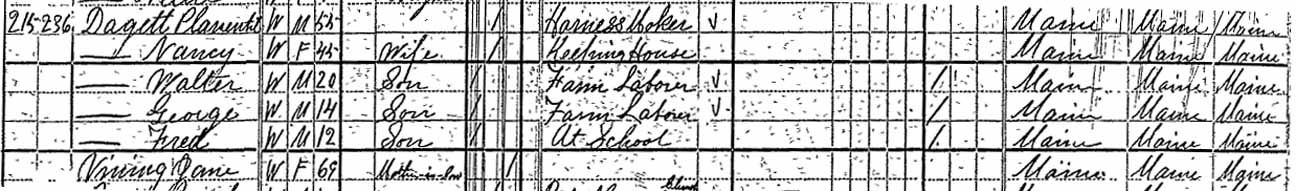 1880 Strong, Franklin County, Maine - dwelling 215, family 236. In 1880, Jane C. (Thomas) Vining was living in the household of her daughter (Nancy) and son-in-law (Plementon Dagget Jr.).: