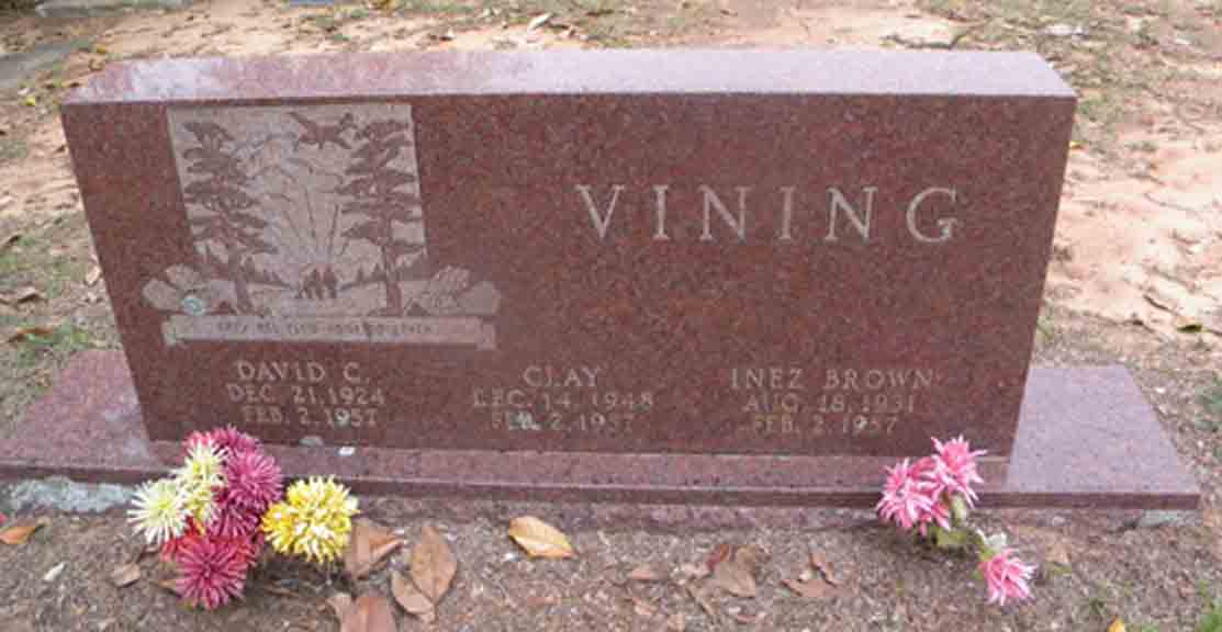 Headstone for David C. Vining, Inez (Brown) Vining, and Clay Vining, in Larissa Cemetery, Mount Selman, Cherokee County, Texas (from Find A Grave):