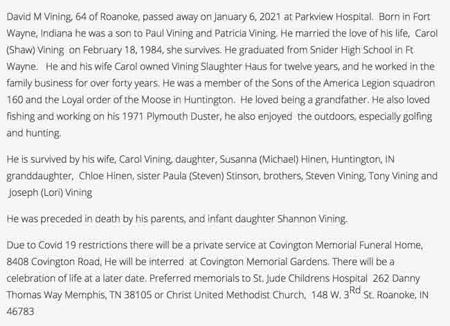 obituary for David M. Vining (from website of Covington Memorial Funeral Home; Fort Wayne, Indiana):