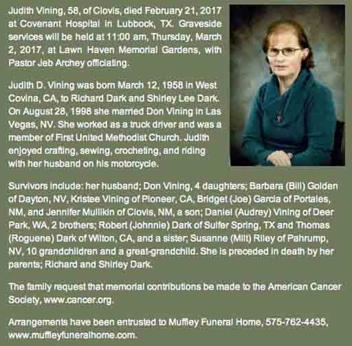 Obituary for Judith (Dark) Vining (from website of Muffley Funeral Home):