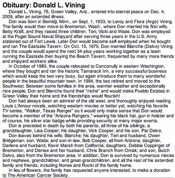 Obituary for Donald L. Vining, from "The Chronicle on the Web" (Omak, Washington):