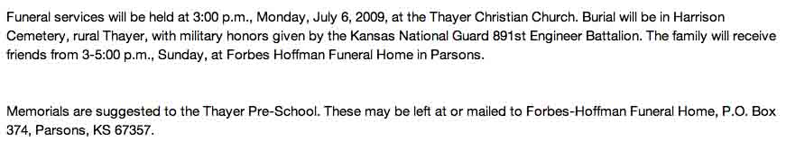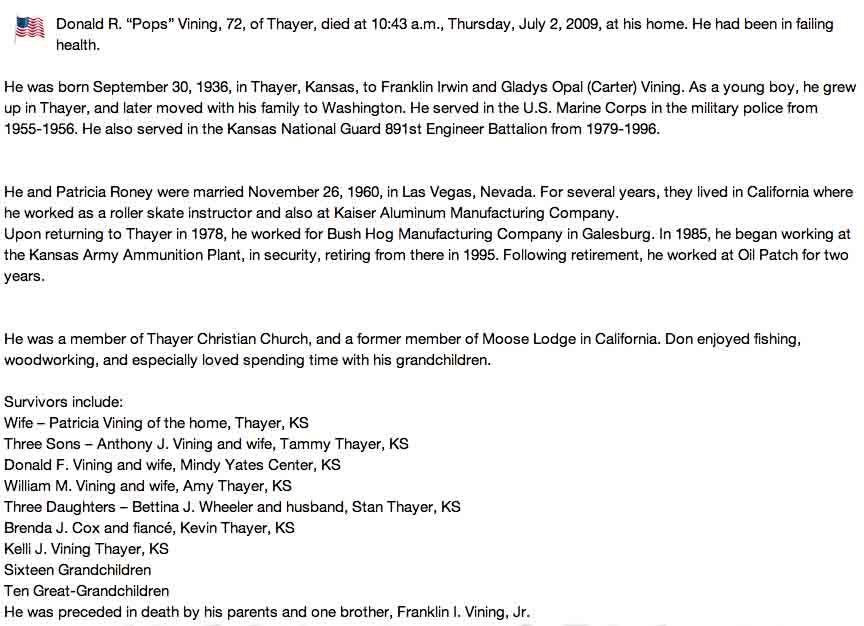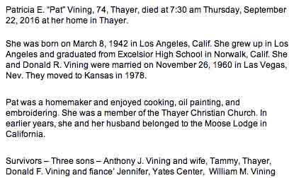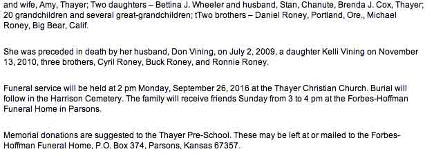 Obituary for Patricia E. (Roney) Vining (posted online by The Chanute Tribune, 23 September 2016):