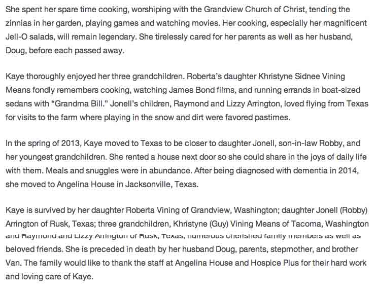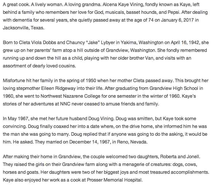 Obituary for Alcena Kaye (Lybyer) Vining: