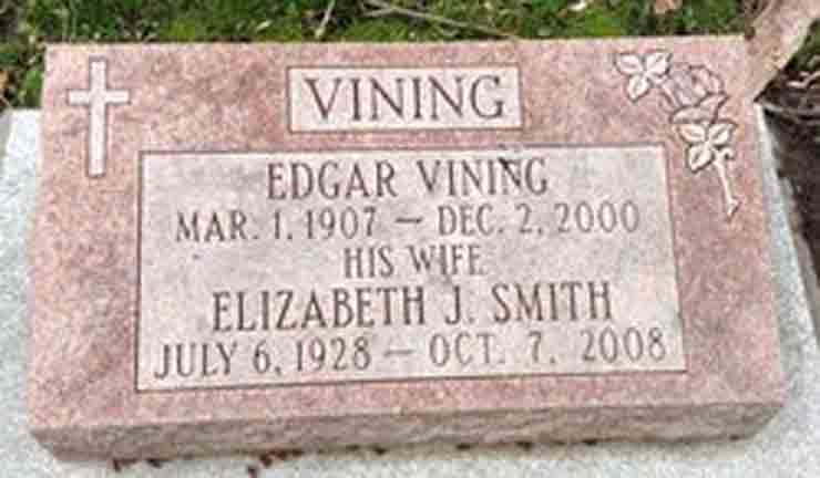 Headstone for Edgar and Elizabeth Janet (Smith) Vining, in Woodlawn Cemetery Cornwall, Stormont, Ontario, Canada (from Finnd A Grave):