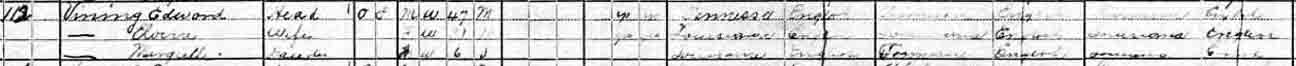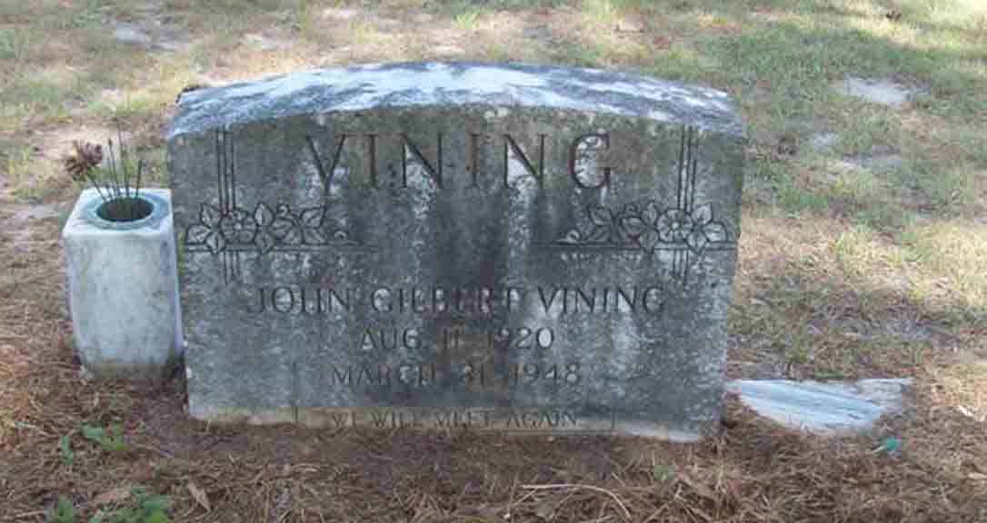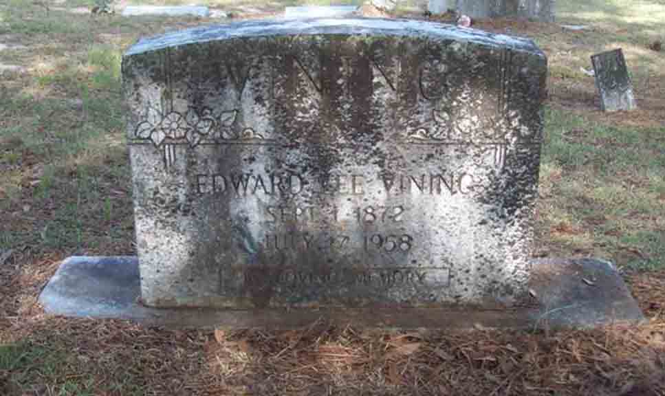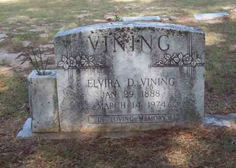 Gravestones for Edward Lee Vining, wife Elvira D. ([…]) Vining, and son John Gilbert Vining, in Leesville Cemetery, Leesville, Vernon Parish, Louisiana (from Find A Grave):