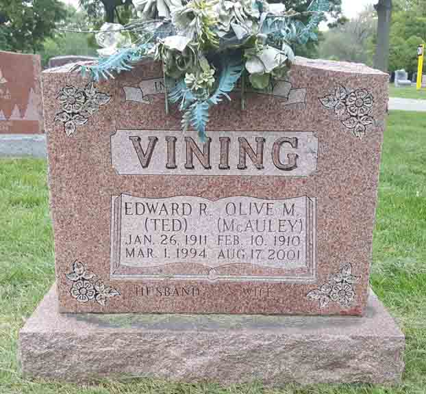 Headstone for Edward R. “Ted” Vining and Olive (McAuley) Vining, in Woodland Cemetery, London, Middlesex County, Ontario, Canada (from Find A Grave):