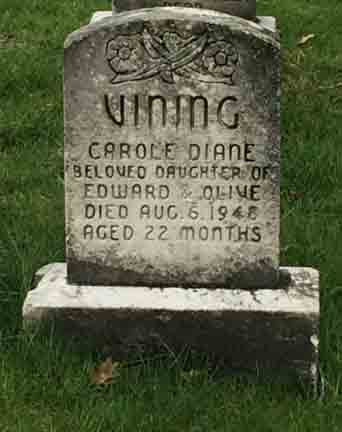 Gravestone for Carole Diane Vining, daughter of Edward R. “Ted” Vining and Olive (McAuley) Vining, in Woodland Cemetery, London, Middlesex County, Ontario, Canada (from Find A Grave):