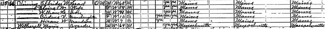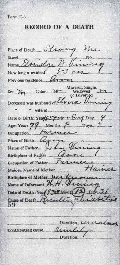 1920 Strong, Franklin County, Maine - dwelling 135, family 166. The recently widowed (5 June 1919) William H. Vining returned home with his two children, Birdena [V. or U.?] and Hiram W.: