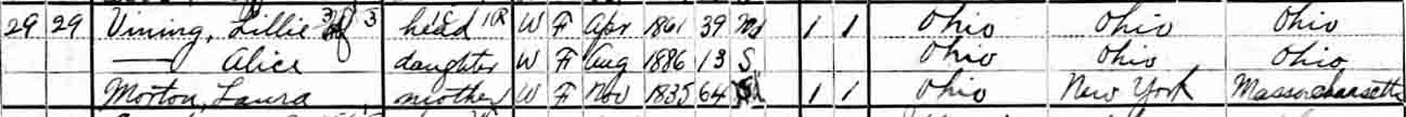 Bennington Township, Morrow County, Ohio - dwelling 29, family 29. Also living in this household in 1900 was Laura Morton (64 y., b. Ohio), the widowed mother of Lillie Vining.: