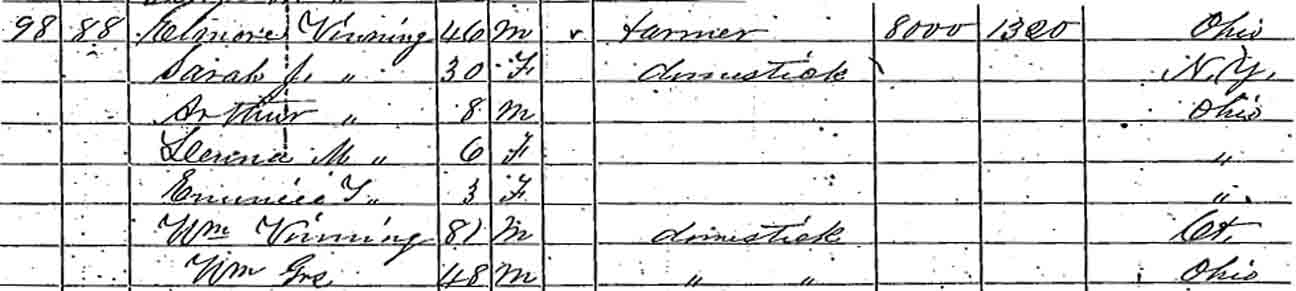 1860 Sharon Township, Franklin County, Ohio - dwelling 98, family 88. Also living in this household in 1860 were Elmer Vining's father, William Vining, and his brother, William [Jr.?].: