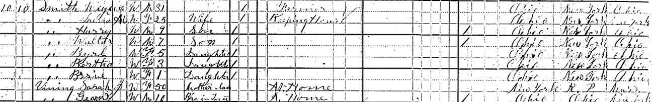 1880 Sharon Township, Franklin County, Ohio - dwelling 10, family 10. By 1880 L[...?] May Vining was married to [...] Smith and had five children, and living with them were Sarah Jane Vining (50 y., b. New York, her mother) and George Vining (10 y., b. Ohio, her brother).: