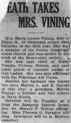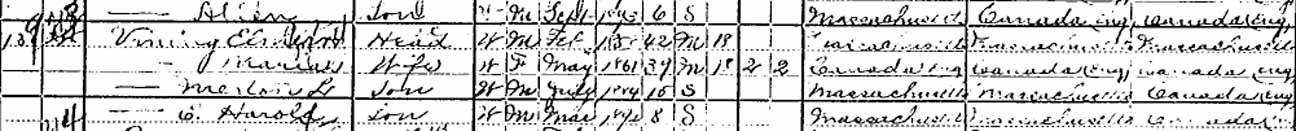 1910 Brockton (Ward 1), Plymouth County, Massachusetts - dwelling 21, family 26. Also living in this household in 1910 was Effie [E.?] Bates, a boarder who would become the wife of Merton Leon Vining.: