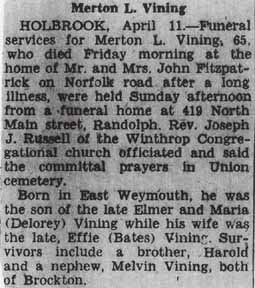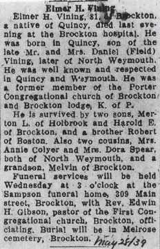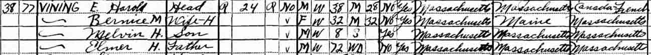 1930 Brockton (Ward 1), Plymouth County, Massachusetts - dwelling 38, family 77. In 1930, the widowed Elmer Howard Vining was living in the household of son Elmer Harold Vining.: