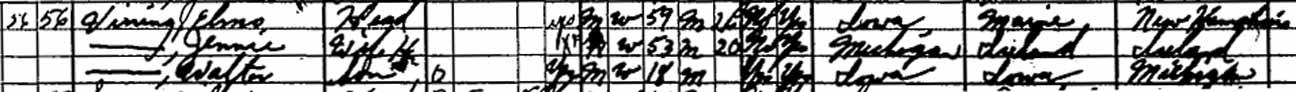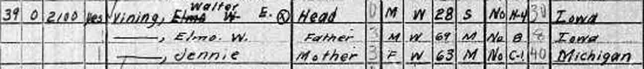 1920 West Lincoln Township, Mitchell County, Iowa - dwelling 48, family 48. Also living in this household in 1920 was Lucretia Vining (widowed mother of Elmo William Vining, 80 y., b. New Hampshire).: