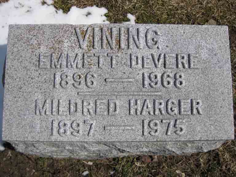 Headstone for Emmett Devere Vining and Mildred Ann (Harger), in North Farmington Cemetery, Farmington Hills, Oakland County, Michigan (from Find A Grave):