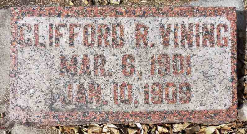 Gravestone for Clifford R. Vining, son of Ernest L. Vining and Hattie M. (Schoessow) Vining, in Watson Cemetery, Leonard, Cass County, North Dakota (from Find A Grave):
