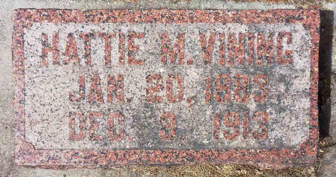 Gravestones for Ernest L. Vining and Hattie M. (Schoessow) Vining, in Watson Cemetery, Leonard, Cass County, North Dakota (from Find A Grave):
