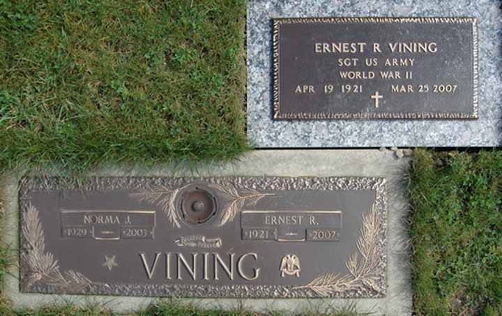 Gravestones for Ernest Ray Vining and Norma Jean (Puschel) Vining, in Flint Memorial Park Cemetery, Mt. Morris, Michigan