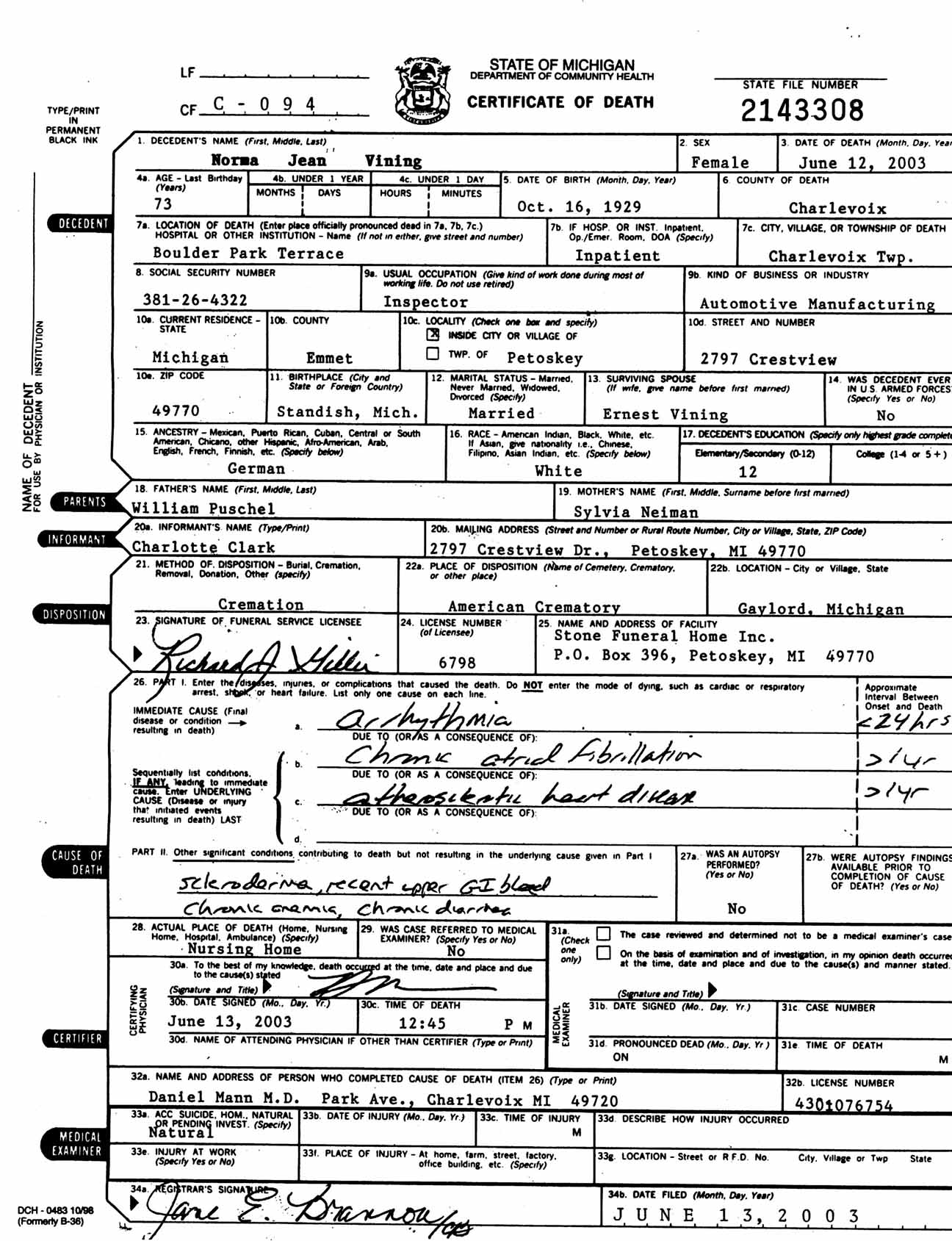 Documentation for Ernest Ray Vining - Norma Jean Puschel