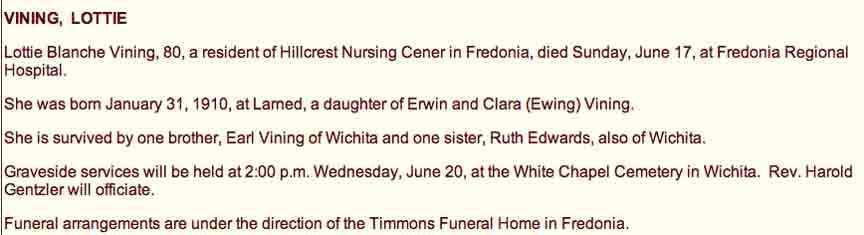 1920 In 1920, Ruth Vining was living in the Caney, Montgomery County, Kansas, household of her uncle and aunt. Charles Vining was boarding in the Fall River, Wilson County, Kansas, household of a Beard family. Franklin Erwin Vining was living in the Fall River, Wilson County, Kansas, household of his grandfather (Franklin E. Vining) and grandmother (Alice Flossie (Lindsley) Vining).: