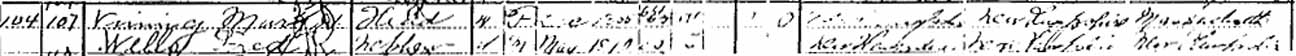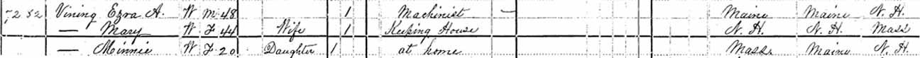 1900 Lowell (ward [2?]), Middlesex County, Massachusetts - dwelling 104, family 109 (renumbering of this family to 109 on the census record is outside the range of the image below). Also living in this household in 1900 was Fred Wells (nephew of Mary Jane (Wells) Vining).: