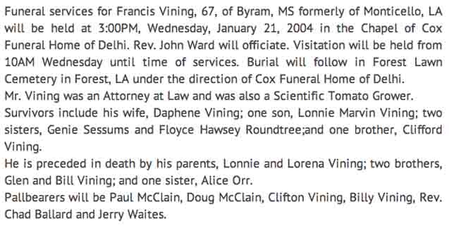 Obituary for Francis Marvin Vining (from Website of Cox Funeral Home; Delhi, Louisiana):
