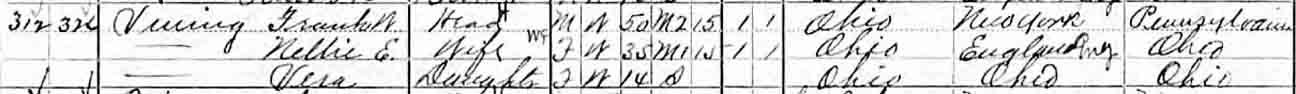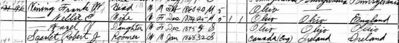 1900 Lorain (ward 2), Lorain County, Ohio - dwelling 140, family [199?]. Also living in this household in 1900 was Robert J. Scarlet (b. January 1868, Canada).: