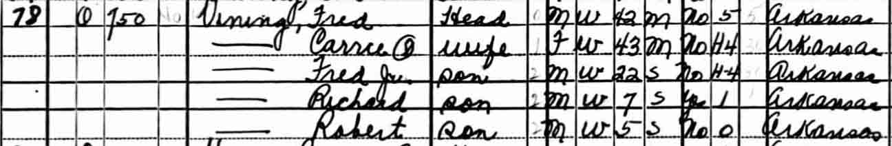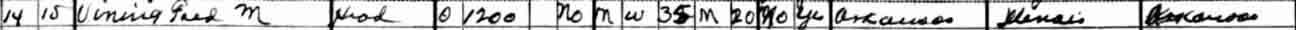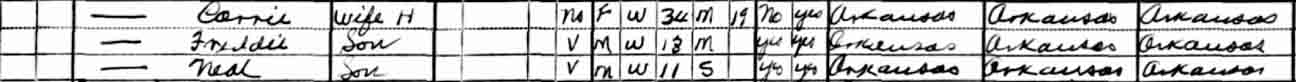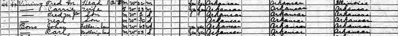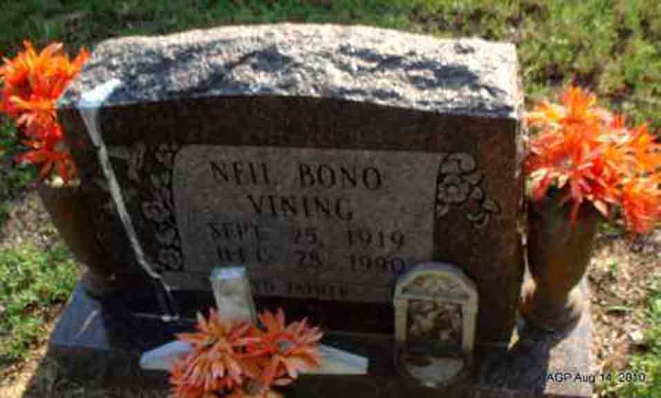 Gravestone for Neil Bono Vining, son of Fred M. Vining and Carrie C. (Bono) Vining, in Varnell Cemetery, Rison, Cleveland County, Arkansas (from Find A Grave):