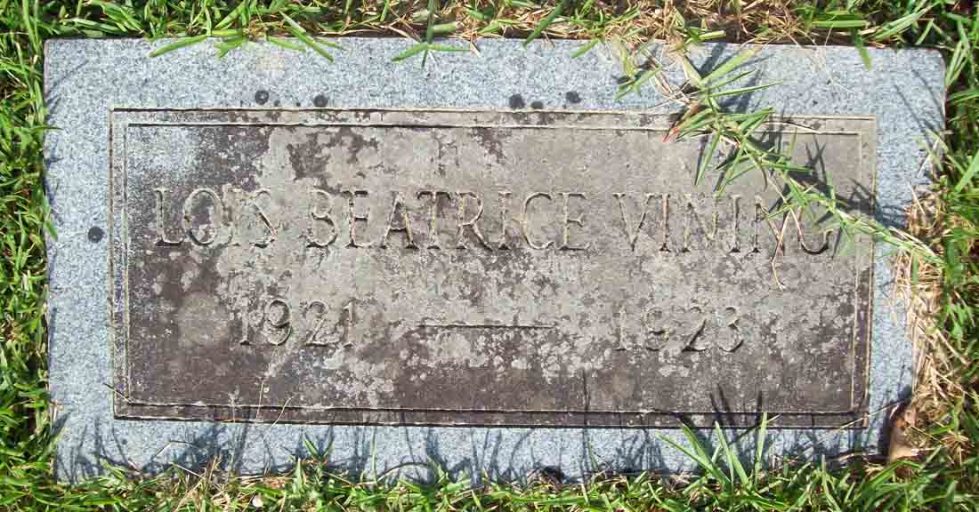 Gravestone for Lois Beatrice Vining, daughter of Fred M. Vining and Carrie C. (Bono) Vining, in Bellwood Cemetery Annex, Pine Bluff, Jefferson County, Arkansas (from Find A Grave):