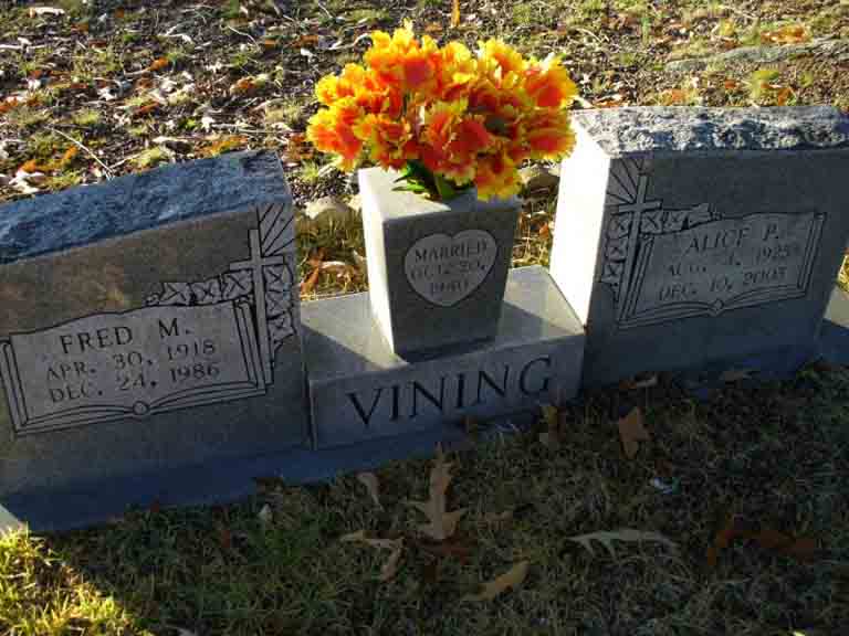 Headstone for Fred M. Vining and Alice (Powers) Vining, son and daughter-in-law of Fred M. Vining and Carrie C. (Bono) Vining, in Magnet Cove Cemetery, Magnet Cove, Hot Spring County, Arkansas (from Find A Grave):