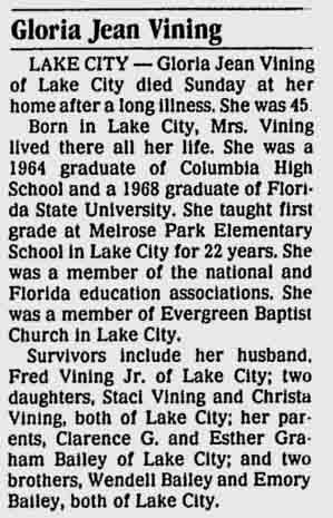 Obituary for Gloria Jean (Bailey) Vining (from 7 April 1992 issue of Gainesville Sun, page 3B, column 6):