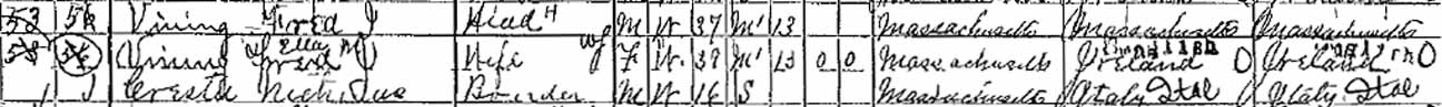 1920 Williamsburg, Hampshire County, Massachusetts - dwelling 74, family 79. Also living in this household in 1920 were Mary P. Vining (widowed mother of Frederick J. Vining, 80 y., b. Massachusetts), John J. Mara (hired man, 17 y., b. Massachusetts), and Edward L. O'Brien (lodger, 14 y., b. Massachusetts).: