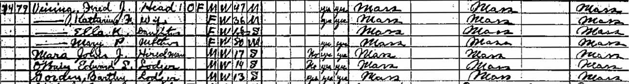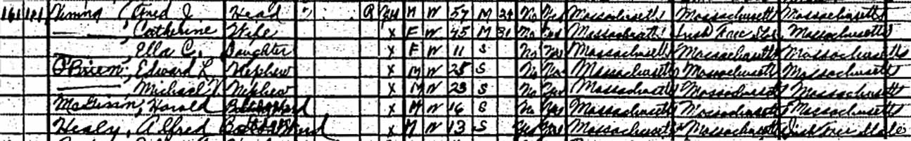 1930 Williamsburg, Hampshire County, Massachusetts - dwelling 161, family 161. Also living in this household in 1930 were Edward L. O'Brien (nephew of Frederick J. Vining, 25 y., b. Massachusetts), Michael V. O'Brien (nephew of Frederick J. Vining, 23 y., b. Massachusetts), Harold McGinn (16 y., b. Massachusetts), and Alfred Healy (13 y., b. Massachusetts).: