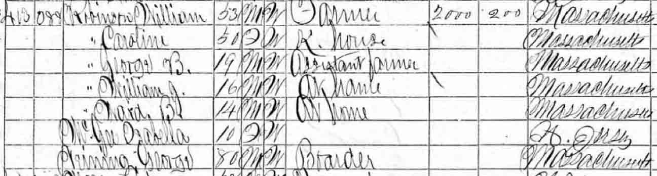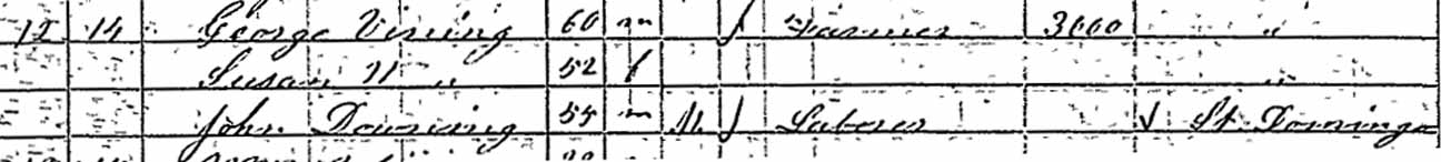 1850 Plainfield, Hampshire County, Massachusetts - dwelling 12, family 14. Also living in this household in 1850 was John Downing (laborer, 55 y., b. St. Domingo).: