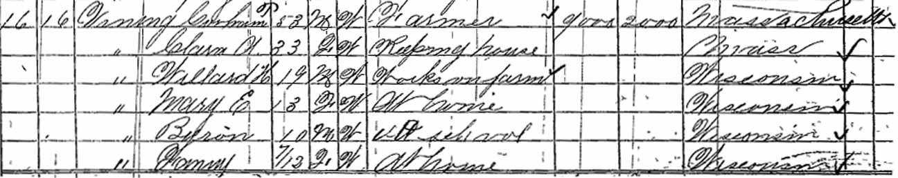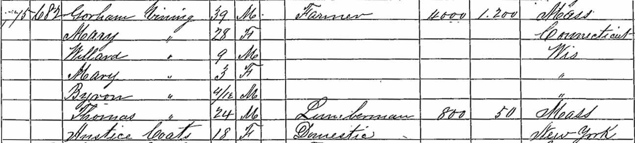 1860 Neenah, Winnebago County, Wisconsin - dwelling 775, family 682. Also living in this household in 1860 were Thomas Vining (24 y., b. Massachusetts), and Hustice Coats (18 y., New York).: