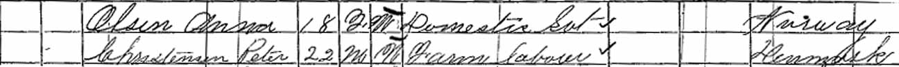 1870 Neenah, Winnebago County, Wisconsin - dwelling 16, family 16. Also living in this household in 1870 were Anna Olsen (18 y., b. Norway) and Peter Christensen (22 y., b. Denmark).: