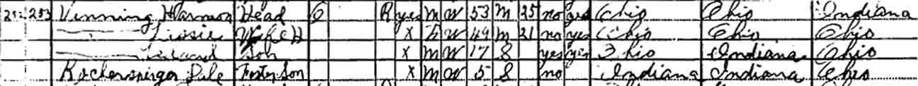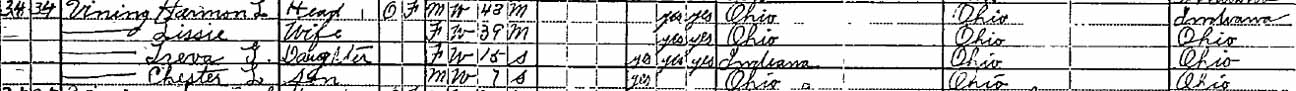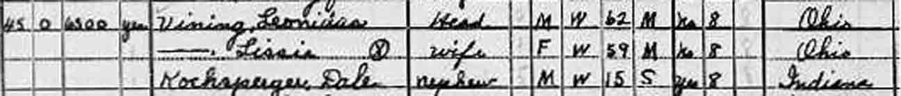 1930 Mississinawa, Darke County, Ohio - dwelling 202, family 203. Also living in this household in 1930 was Dale Kochersperger (5 y., b. Indiana), Harmon Leonidist and Lissie (Emmons) Vining's "foster son" and also their nephew.: