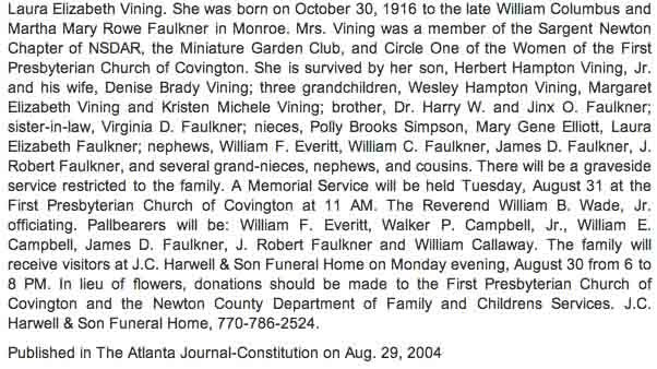 Gravestonea for Herbert Hampton Vining and Margaret (Faulkner) Vining, in Covington City Cemetery, Covington, Newton County, Georgia (from Find A Grave):