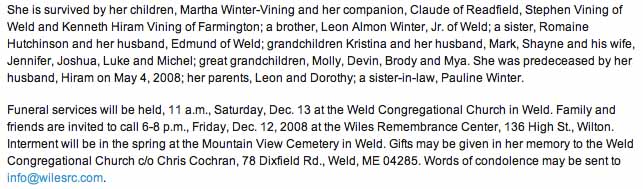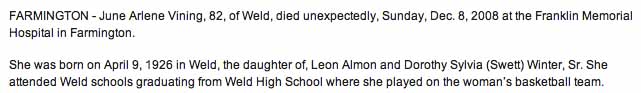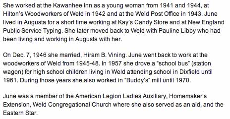 Gravestones for Hiram Bertrand Vining and June Arlene (Winter) Vining, in Mountain View Cemetery, Weld, Franklin County, Maine (from Find A Grave):